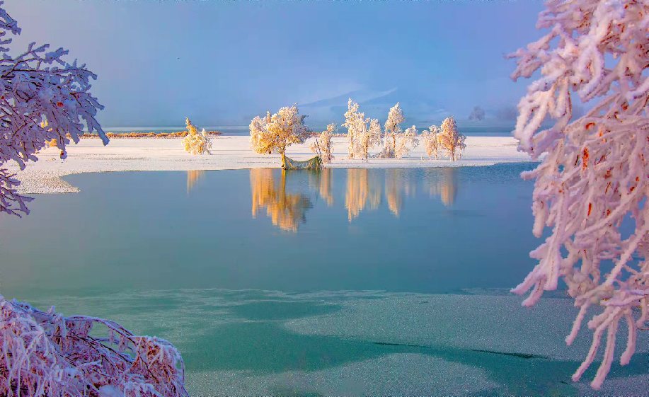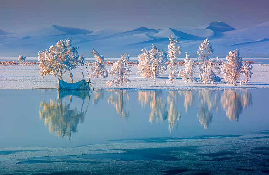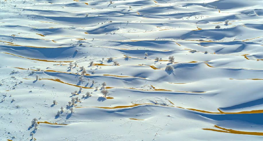 After snowfall, the yellow desert sand, covered with an expanse of ethereal white snow, was still visible beneath the snow.