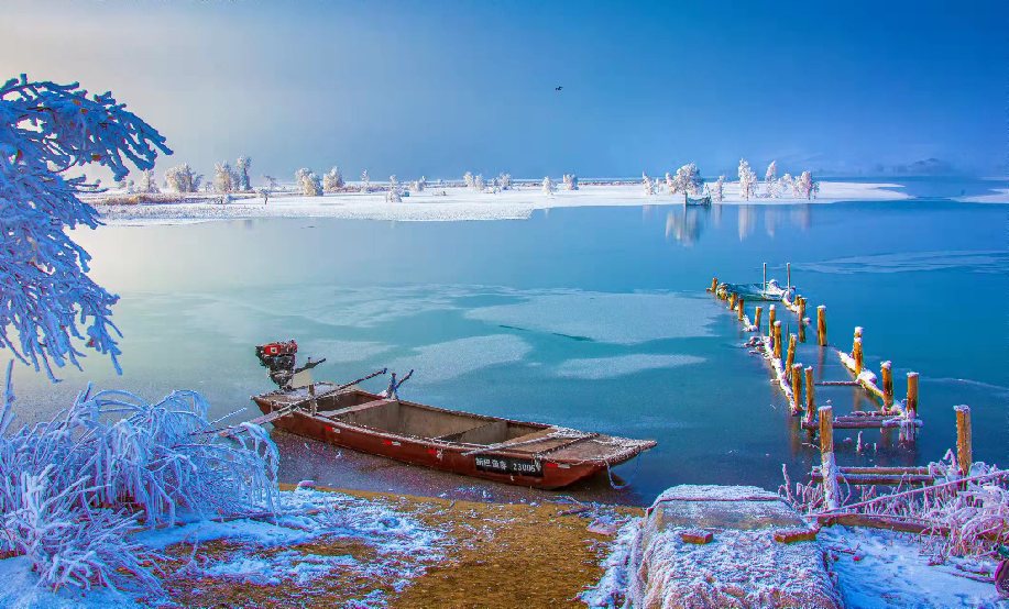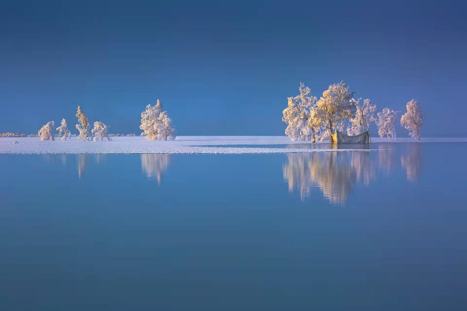 Photos show the snow covered sand dunes next to an icy lake, surrounded by poplars, under a perfect blue sky.