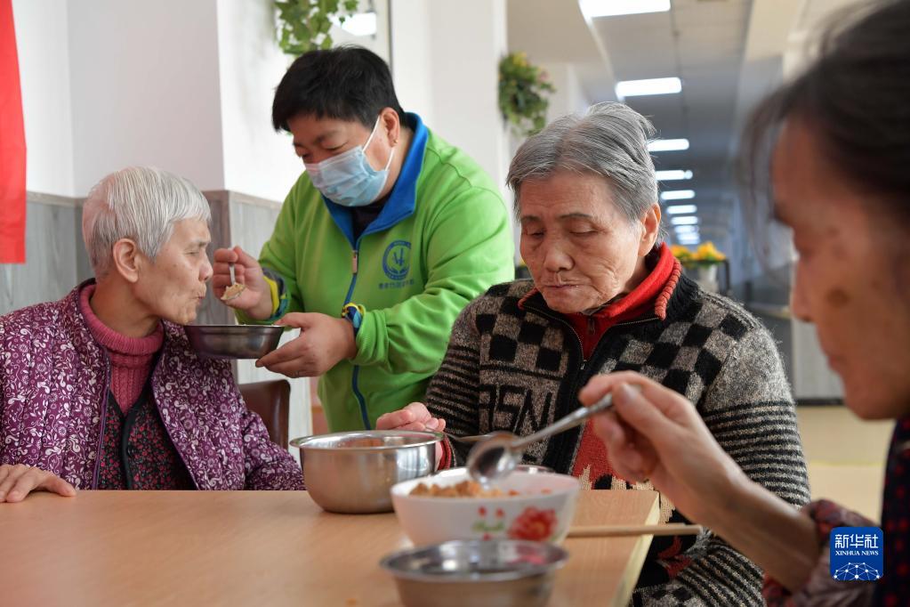 Senior citizens eat lunch at community canteen inHongxiao Community, Qingyunpu District of Nanchang, east China's Jiangxi Province on Dec. 7,2021. In Nanchang's Hongxiao Community there are many solitary, disabled, or childless elderly who have no family to help them in their old age. As part of a community action designed to provide public services to the elderly, a community canteen was opened here with the help of social organizations, where these people can receive their midday meals free of charge. Volunteers also send meals directly to the doors of elderly who are infirm or have mobility issues.(Xinhua/Peng Zhaozhi)