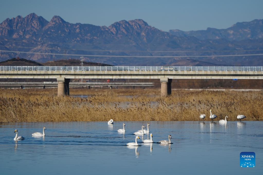 Swans are pictured on the Qingshui river in Miyun District of Beijing, capital of China, Dec. 7, 2021. (Xinhua/Chen Yehua)