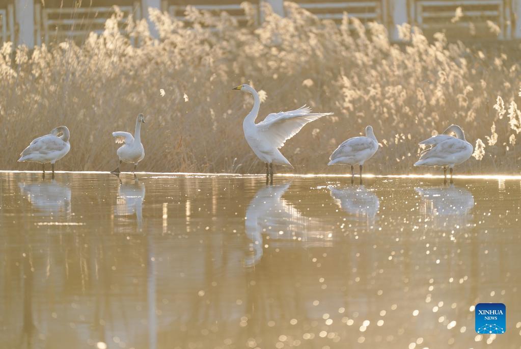 Swans are pictured on the Qingshui river in Miyun District of Beijing, capital of China, Dec. 7, 2021. (Xinhua/Chen Yehua)