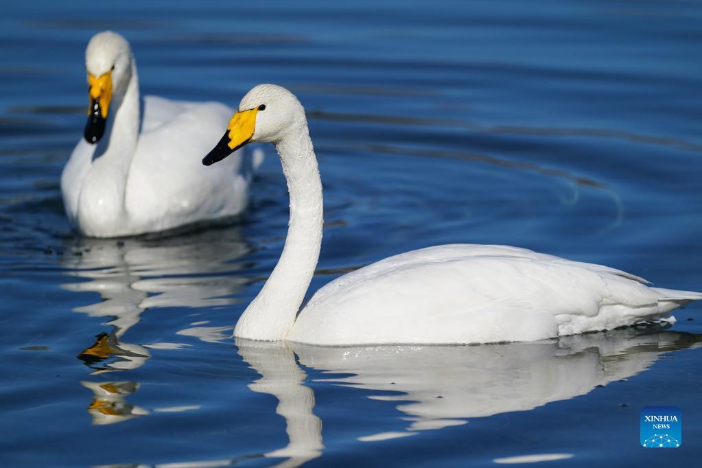 Swans are pictured on the Qingshui river in Miyun District of Beijing, capital of China, Dec. 7, 2021. (Xinhua/Chen Yehua)
