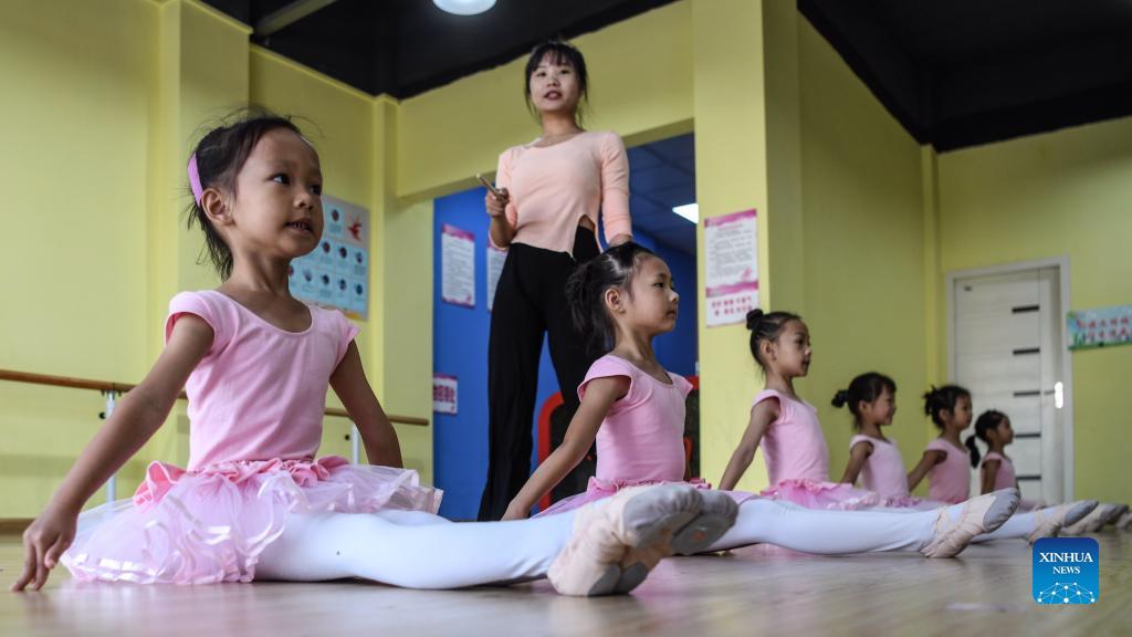 Children practice ballet at the Rongkang community in Chang'an Township of Rong'an County, south China's Guangxi Zhuang Autonomous Region, July 15, 2021. The Rongkang community is a relocation site for poverty alleviation. Residents live a peaceful and contented life here. (Xinhua/Zhang Ailin)