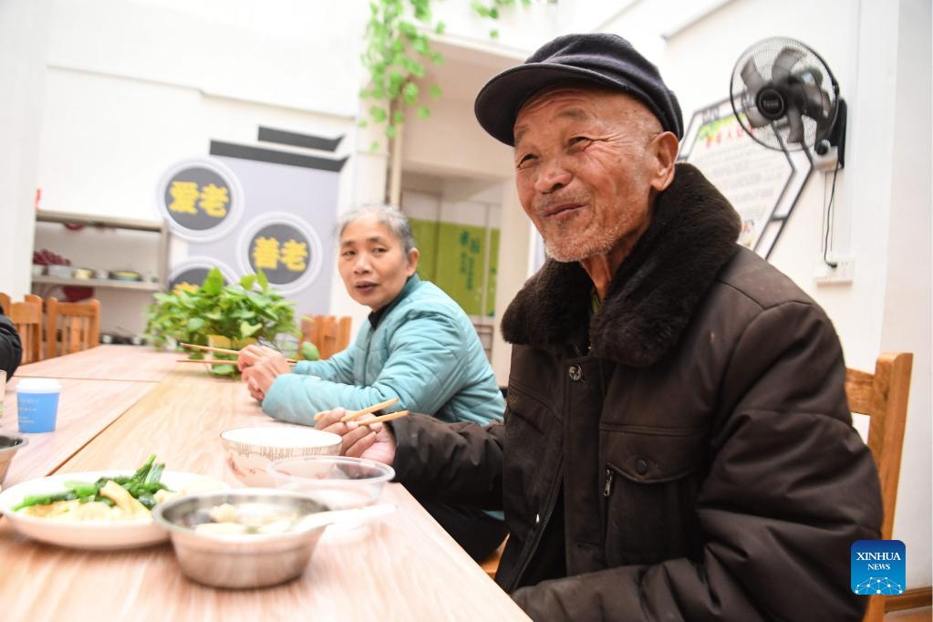 Senior residents have lunch at a canteen of the Rongkang community in Chang'an Township, Rong'an County, south China's Guangxi Zhuang Autonomous Region, Dec. 7, 2021. The Rongkang community is a relocation site for poverty alleviation. Residents live a peaceful and contented life here. (Xinhua/Zhang Ailin)