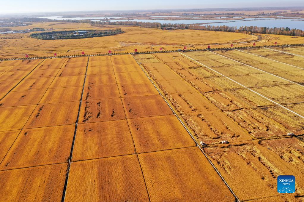 Aerial photo taken on Oct. 12, 2021 shows farmers harvesting rice in Yongji County of Jilin City, northeast China's Jilin Province. Jilin recorded a bumper grain harvest, with the total grain output reaching 40.39 million tonnes this year, up more than 2.36 million tonnes year on year, according to data released by the National Bureau of Statistics. (Xinhua/Zhang Nan)