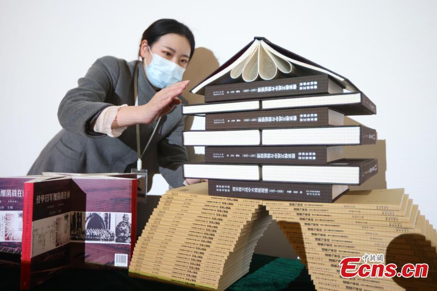 A staff member places books at the publishing event held at the Memorial Hall of the Victims in Nanjing Massacre by Japanese Invaders in Nanjing, East China's Jiangsu Province, Dec. 7, 2021. (Photo: China News Service/Yang Bo)