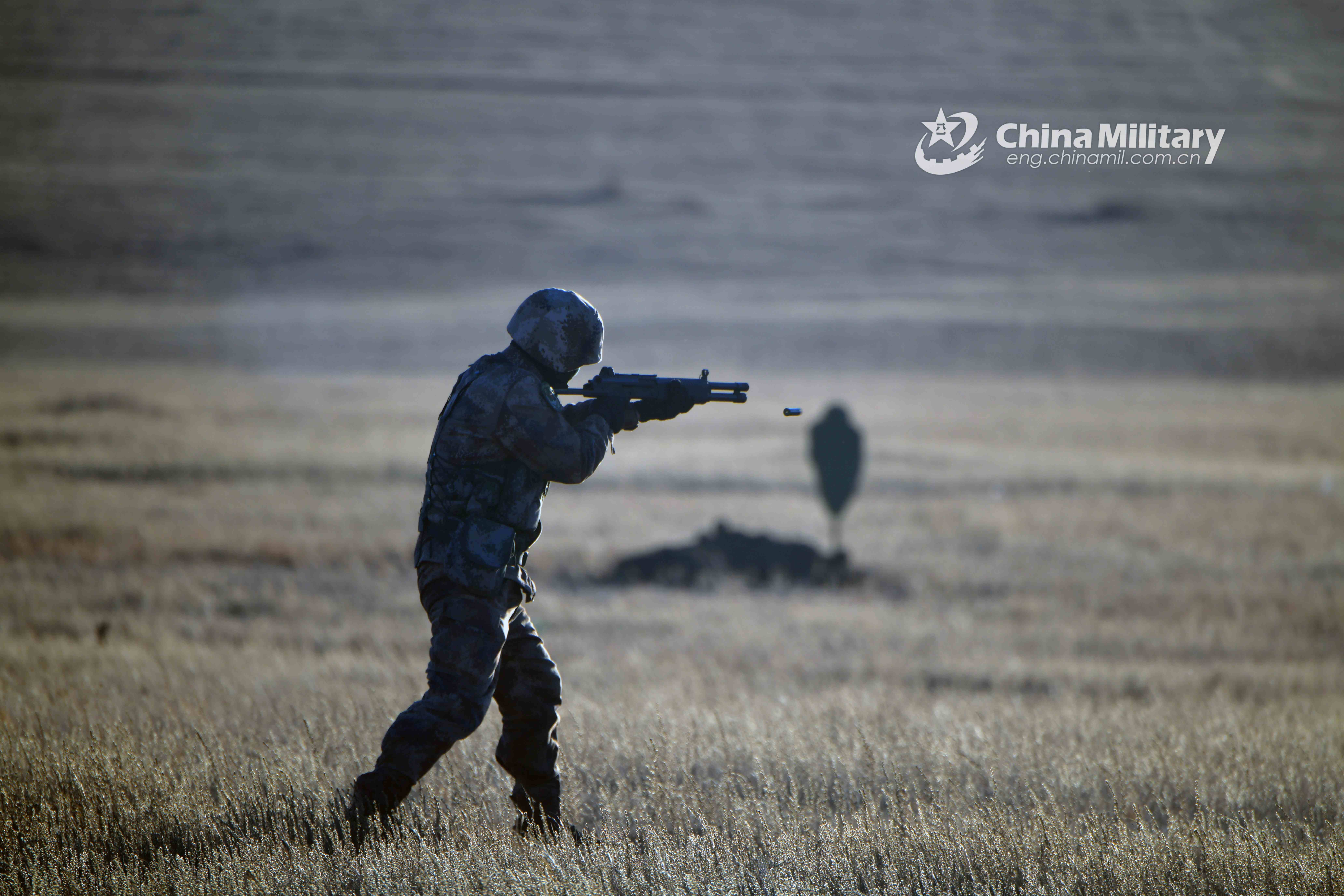 An infantryman assigned to a brigade under the PLA 81st Group Army raises his rifle and engages in mock targets during a field training operation of an integrated training exercise on November 23, 2021. (eng.chinamil.com.cn/Photo by Yang Pengfei)