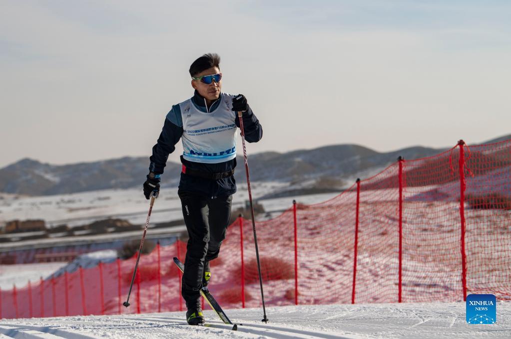 Torsongan Bullik practices skiing in Wenquan County, northwest China's Xinjiang Uygur Autonomous Region, Nov. 23, 2021. Torsongan Bullik is a Xinjiang cross-country skiing athlete. He used to be a cyclist and won several champions. Torsongan Bullik shifted from cycling to cross-country skiing on November 20, 2018. He went for cross-country skiing, because there is a chance to attend the Olympics. There is a huge difference between cycling and cross-country skiing, but the Olympic dream led Xinjiang athlete come over all challenges. He is now well prepared and ready to fight for the championship in 2022 Beijing Olympics. (Xinhua/Hu Huhu)