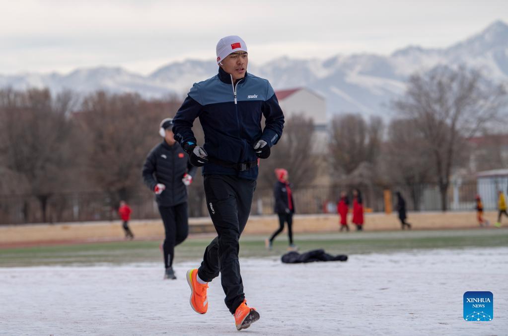 Torsongan Bullik runs during a training in Wenquan County, northwest China's Xinjiang Uygur Autonomous Region, Nov. 22, 2021. Torsongan Bullik is a Xinjiang cross-country skiing athlete. He used to be a cyclist and won several champions. Torsongan Bullik shifted from cycling to cross-country skiing on November 20, 2018. He went for cross-country skiing, because there is a chance to attend the Olympics. There is a huge difference between cycling and cross-country skiing, but the Olympic dream led Xinjiang athlete come over all challenges. He is now well prepared and ready to fight for the championship in 2022 Beijing Olympics. (Xinhua/Hu Huhu)