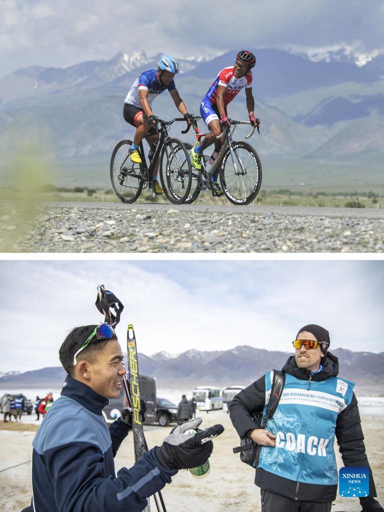 Above: Torsongan Bullik practices cycling in Wenquan County, northwest China's Xinjiang Uygur Autonomous Region, May 29, 2017. Below: Torsongan Bullik talks to his coach Ole Marius Bach in Wenquan County, northwest China's Xinjiang Uygur Autonomous Region, Nov. 22, 2021. Torsongan Bullik is a Xinjiang cross-country skiing athlete. He used to be a cyclist and won several champions. Torsongan Bullik shifted from cycling to cross-country skiing on November 20, 2018. He went for cross-country skiing, because there is a chance to attend the Olympics. There is a huge difference between cycling and cross-country skiing, but the Olympic dream led Xinjiang athlete come over all challenges. He is now well prepared and ready to fight for the championship in 2022 Beijing Olympics. (Xinhua/Hu Huhu)