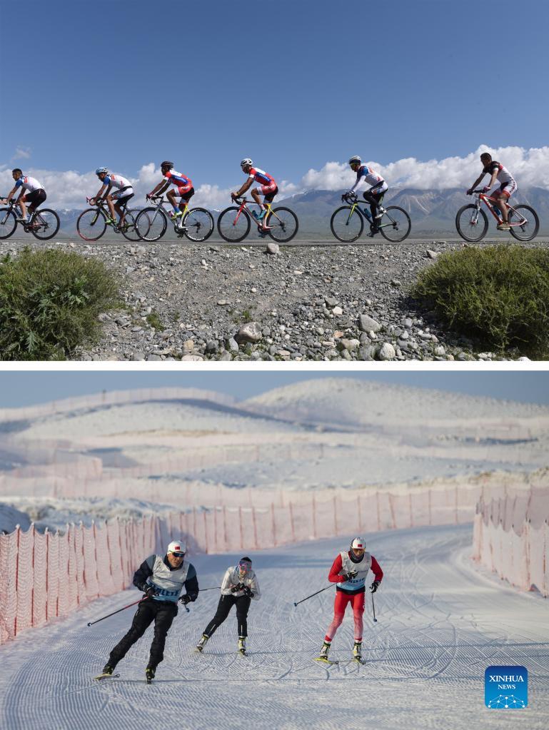 Above: Torsongan Bullik competes in the 11th Cycling Tour of Sayram Lake in Wenquan County, northwest China's Xinjiang Uygur Autonomous Region, May 29, 2017. Below: Torsongan Bullik practices skiing in Wenquan County, northwest China's Xinjiang Uygur Autonomous Region, Nov. 21, 2021. Torsongan Bullik is a Xinjiang cross-country skiing athlete. He used to be a cyclist and won several champions. Torsongan Bullik shifted from cycling to cross-country skiing on November 20, 2018. He went for cross-country skiing, because there is a chance to attend the Olympics. There is a huge difference between cycling and cross-country skiing, but the Olympic dream led Xinjiang athlete come over all challenges. He is now well prepared and ready to fight for the championship in 2022 Beijing Olympics. (Xinhua/Hu Huhu)