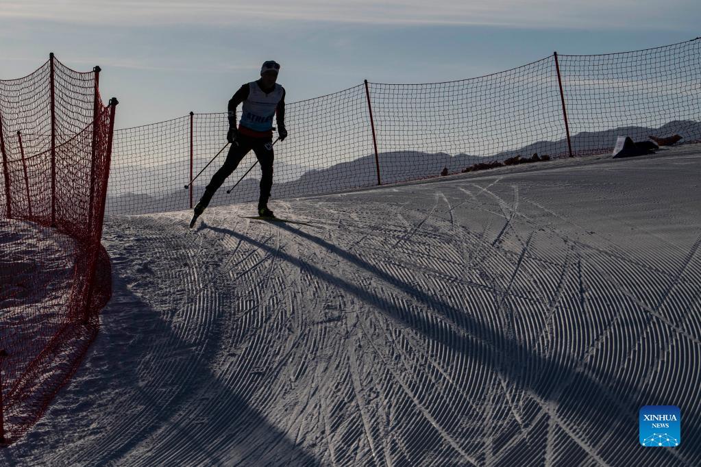 Torsongan Bullik practices skiing in Wenquan County, northwest China's Xinjiang Uygur Autonomous Region, Nov. 25, 2021. Torsongan Bullik is a Xinjiang cross-country skiing athlete. He used to be a cyclist and won several champions. Torsongan Bullik shifted from cycling to cross-country skiing on November 20, 2018. He went for cross-country skiing, because there is a chance to attend the Olympics. There is a huge difference between cycling and cross-country skiing, but the Olympic dream led Xinjiang athlete come over all challenges. He is now well prepared and ready to fight for the championship in 2022 Beijing Olympics. (Xinhua/Hu Huhu)