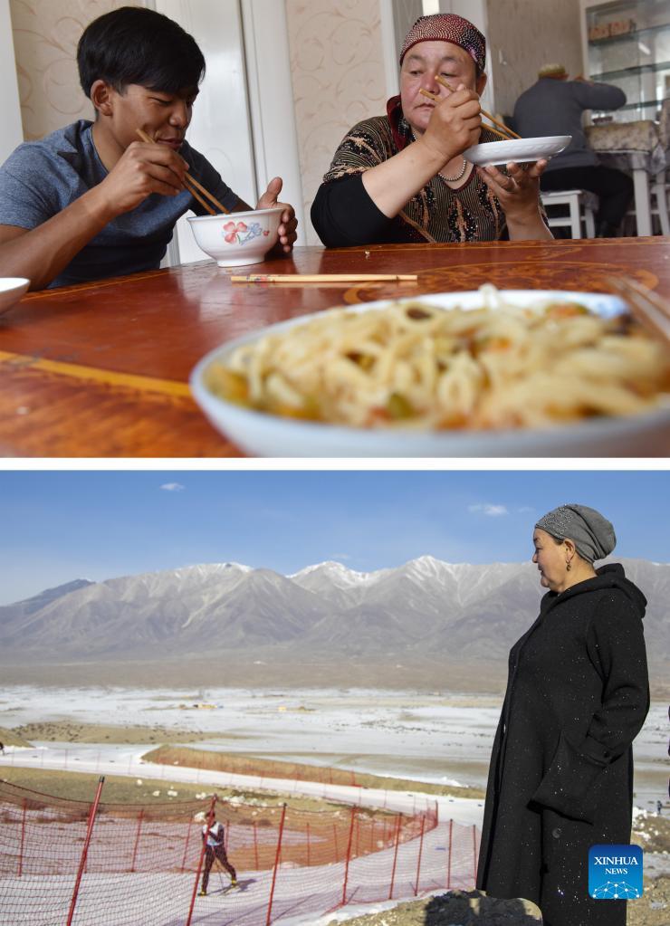 Above: Torsongan Bullik has lunch with his mother at home in Wenquan County, northwest China's Xinjiang Uygur Autonomous Region, Nov. 23, 2021. Below: Torsongan Bullik's mother watch her son skiing in Wenquan County, northwest China's Xinjiang Uygur Autonomous Region, Nov. 23, 2021. Torsongan Bullik is a Xinjiang cross-country skiing athlete. He used to be a cyclist and won several champions. Torsongan Bullik shifted from cycling to cross-country skiing on November 20, 2018. He went for cross-country skiing, because there is a chance to attend the Olympics. There is a huge difference between cycling and cross-country skiing, but the Olympic dream led Xinjiang athlete come over all challenges. He is now well prepared and ready to fight for the championship in 2022 Beijing Olympics. (Xinhua/Hu Huhu)