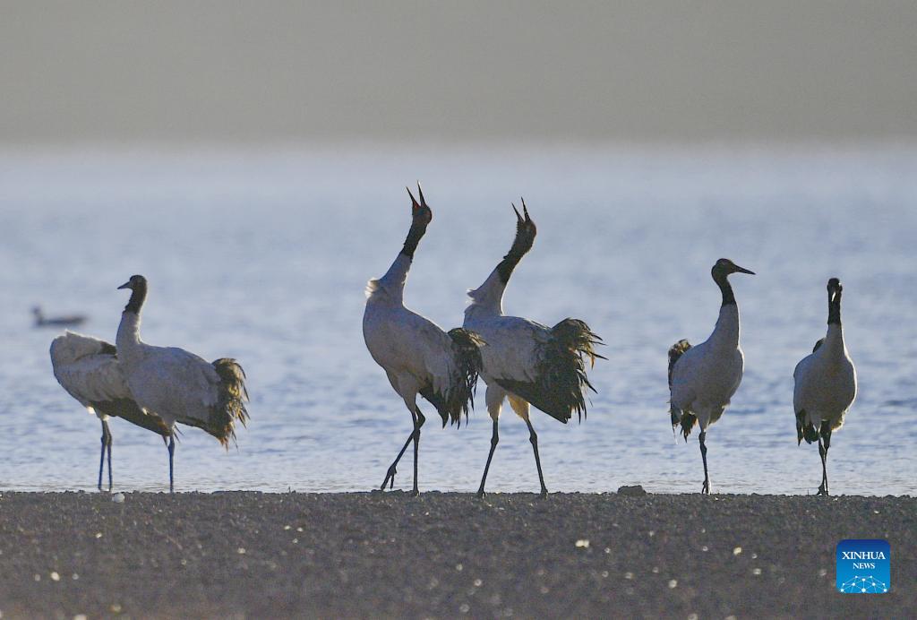 Black-necked cranes are seen at Lhunzhub County of Lhasa, southwest China's Tibet Autonomous Region, Dec. 7, 2021. About 1,500 black-necked cranes have flown to Lhunzhub County for the winter. (Xinhua/Zhang Rufeng)