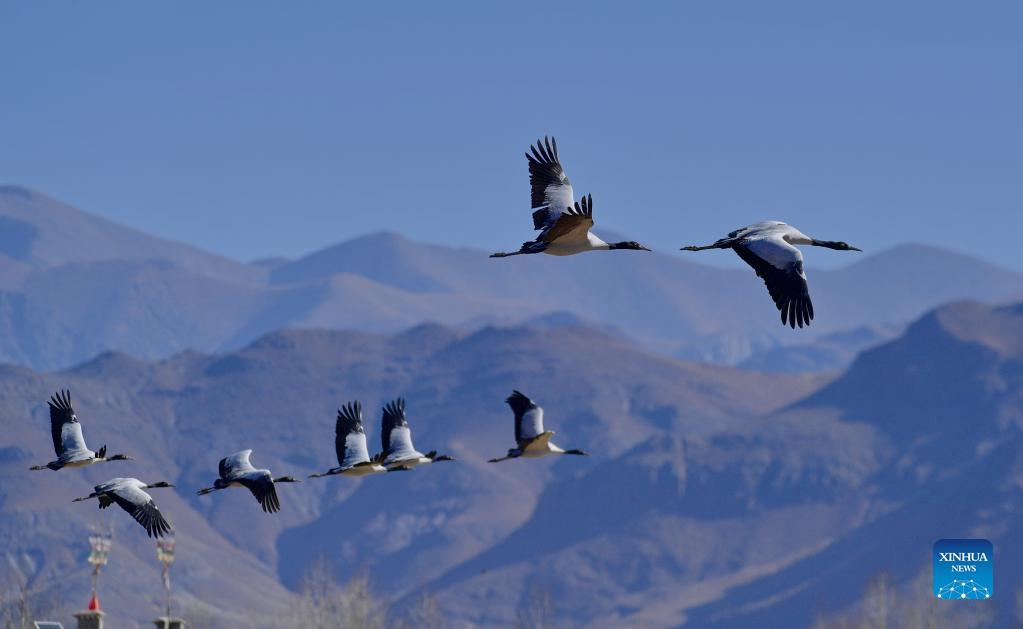 Black-necked cranes are seen at Lhunzhub County of Lhasa, southwest China's Tibet Autonomous Region, Dec. 7, 2021. About 1,500 black-necked cranes have flown to Lhunzhub County for the winter. (Xinhua/Zhang Rufeng)