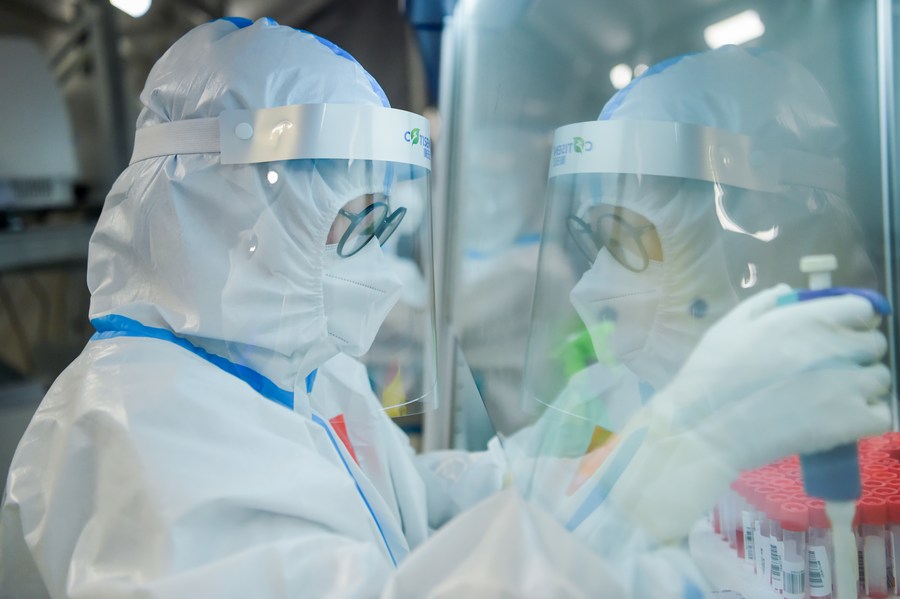 A staff member works in a "Falcon" air-inflated laboratory for COVID-19 nucleic acid testing in Manzhouli, north China's Inner Mongolia Autonomous Region, Dec. 3, 2021. (Xinhua/Li Zhipeng)