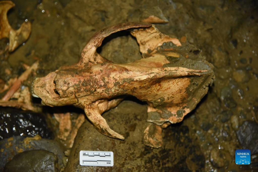 Undated handout photo shows a giant panda fossil found by researchers from the Institute of Mountain Resources under Guizhou Academy of Sciences. A giant panda fossil, dating back over 100,000 years, has been uncovered in Asia's longest cave in southwest China's Guizhou Province, researchers said Wednesday. Researchers from the Institute of Mountain Resources under Guizhou Academy of Sciences found two fossils of the species in Shuanghe Cave, Zunyi City. With the help of tooth-enamel dating technologies, one of the fossils indicates a wild giant panda living about 102,000 years ago, and the other is likely to have existed on the planet around 49,000 years ago. (Institute of Mountain Resources under Guizhou Academy of Sciences/Handout via Xinhua)
