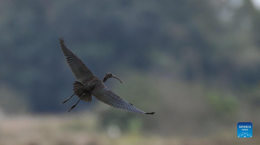 A glossy ibis is spotted in Panshan Village of Xinzhou Town, Danzhou, south China's Hainan Province, Dec. 8, 2021. The glossy ibis, a close relative of the endangered crested ibis, is currently under China's top level of state protection. (Xinhua/Yang Guanyu)