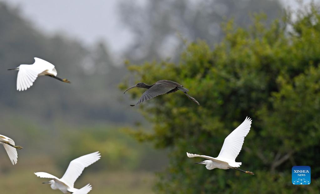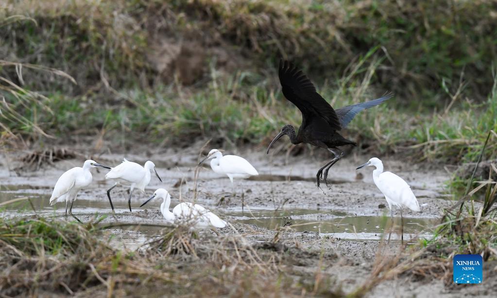 A glossy ibis (C) is spotted in Panshan Village of Xinzhou Town, Danzhou City, south China's Hainan Province, Dec. 8, 2021. The glossy ibis, a close relative of the endangered crested ibis, is currently under China's top level of state protection. (Xinhua/Yang Guanyu)