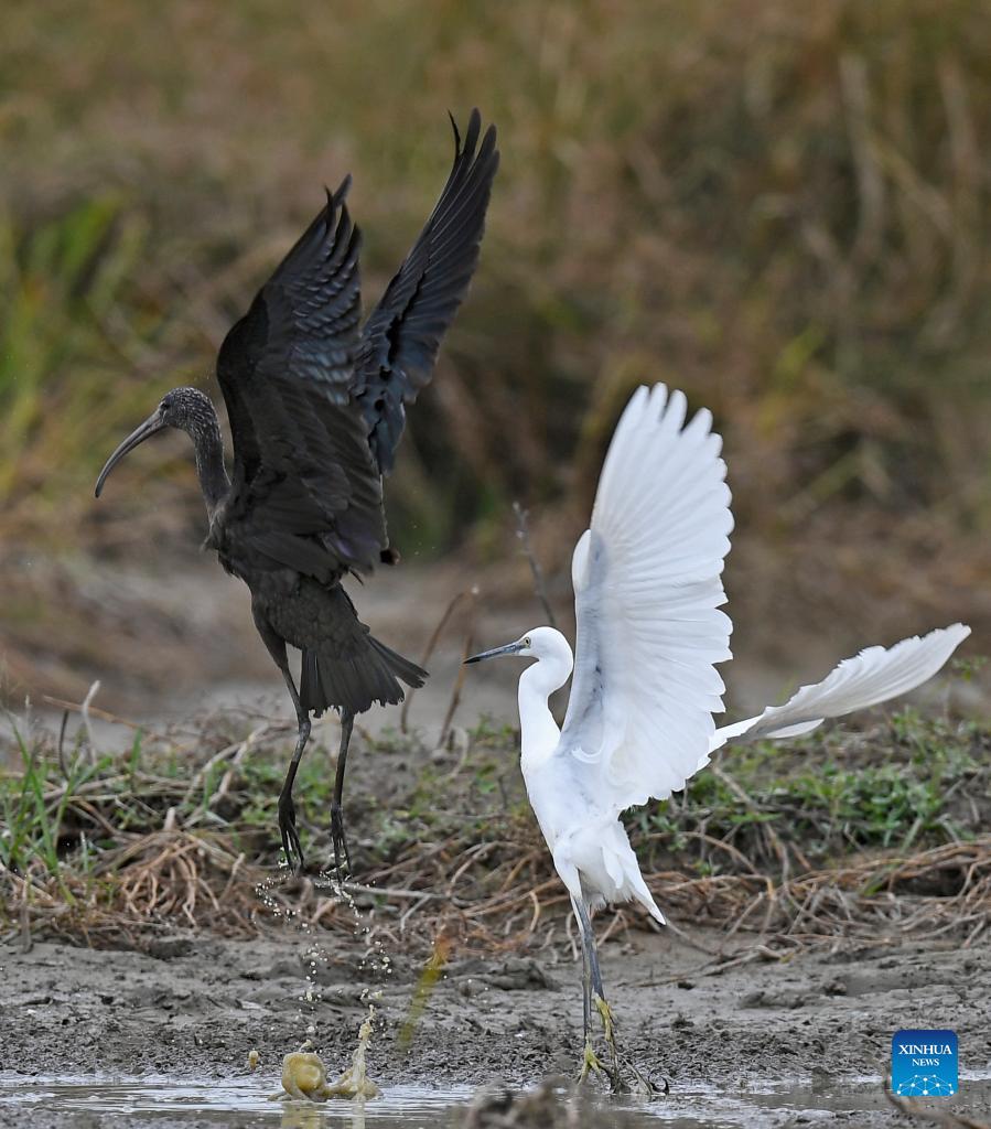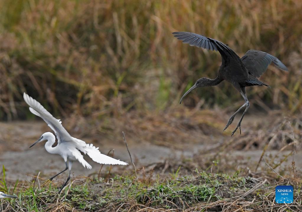 A glossy ibis (L) is spotted in Panshan Village of Xinzhou Town, Danzhou City, south China's Hainan Province, Dec. 8, 2021. The glossy ibis, a close relative of the endangered crested ibis, is currently under China's top level of state protection. (Xinhua/Yang Guanyu)