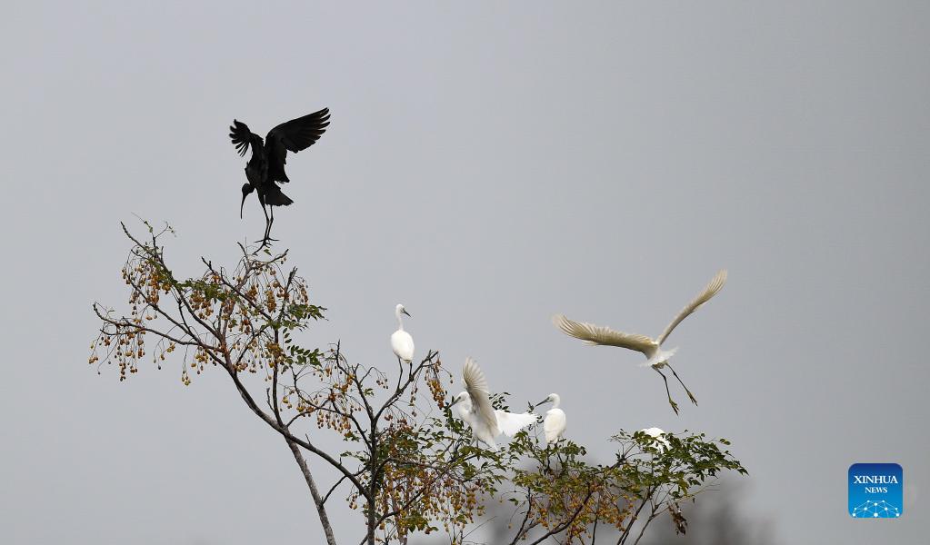 A glossy ibis (2nd R) is spotted in Panshan Village of Xinzhou Town, Danzhou City, south China's Hainan Province, Dec. 8, 2021. The glossy ibis, a close relative of the endangered crested ibis, is currently under China's top level of state protection. (Xinhua/Yang Guanyu)
