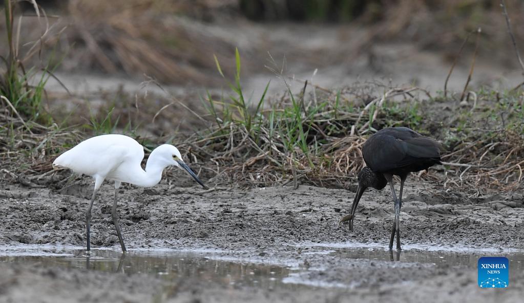 A glossy ibis (R) is spotted in Panshan Village of Xinzhou Town, Danzhou City, south China's Hainan Province, Dec. 8, 2021. The glossy ibis, a close relative of the endangered crested ibis, is currently under China's top level of state protection. (Xinhua/Yang Guanyu)