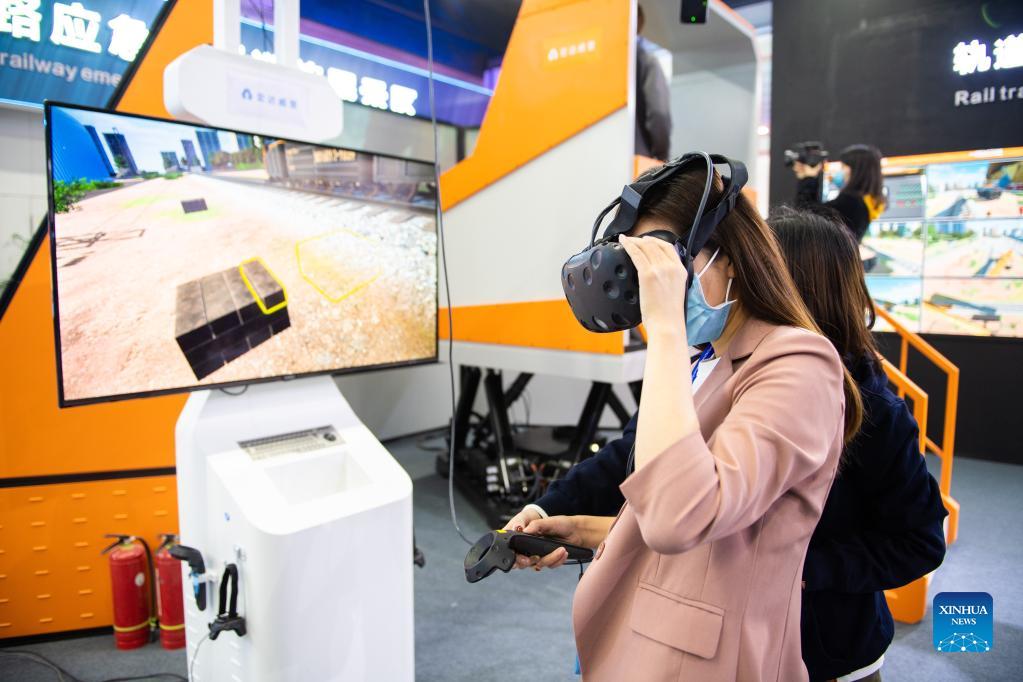 A woman tries a VR device at China International Rail Transit and Equipment Manufacturing Industry Exposition in Zhuzhou, central China's Hunan Province, Dec. 8, 2021. The expo kicked off here on Wednesday. (Xinhua/Chen Sihan)