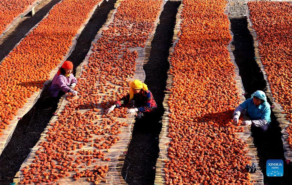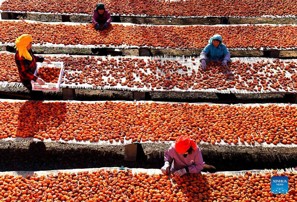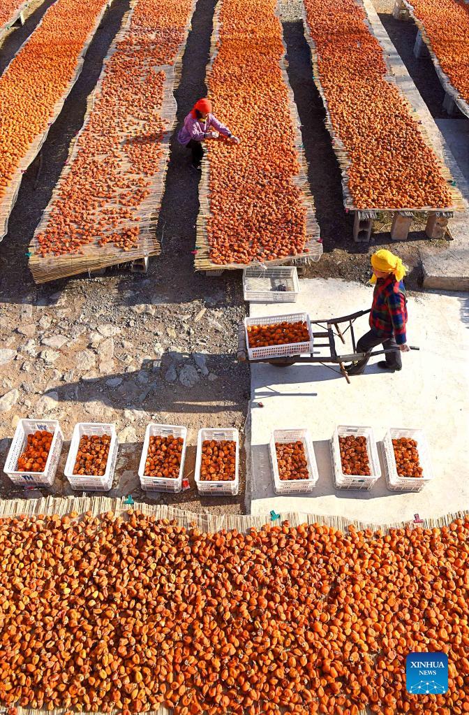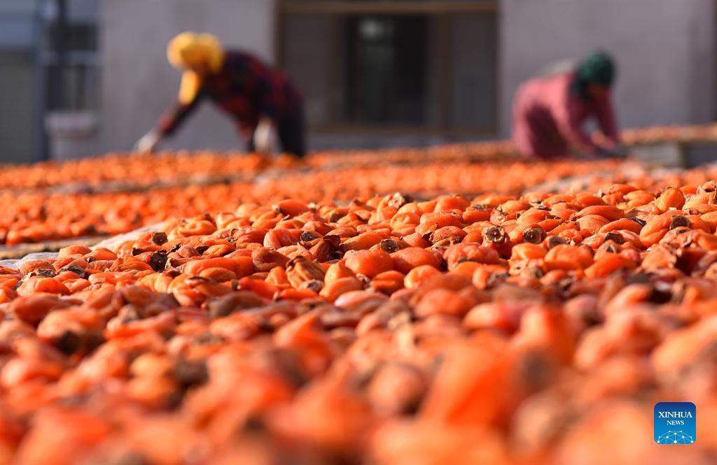 Villagers sort dried persimmons in Yiyuan County of Zibo, east China's Shandong Province, Dec. 7, 2021. Persimmon processing is one of the industries with local features which helps villagers increase income. (Photo by Zhao Dongshan/Xinhua)