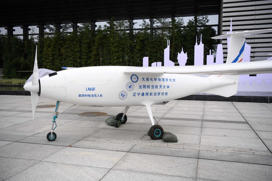 Photo taken on Oct. 19, 2020 shows a hydrogen fuel-cell drone exhibited during the United Nations Development Programme (UNDP) Hydrogen Industry Conference in Foshan, south China's Guangdong Province. (Xinhua/Deng Hua)