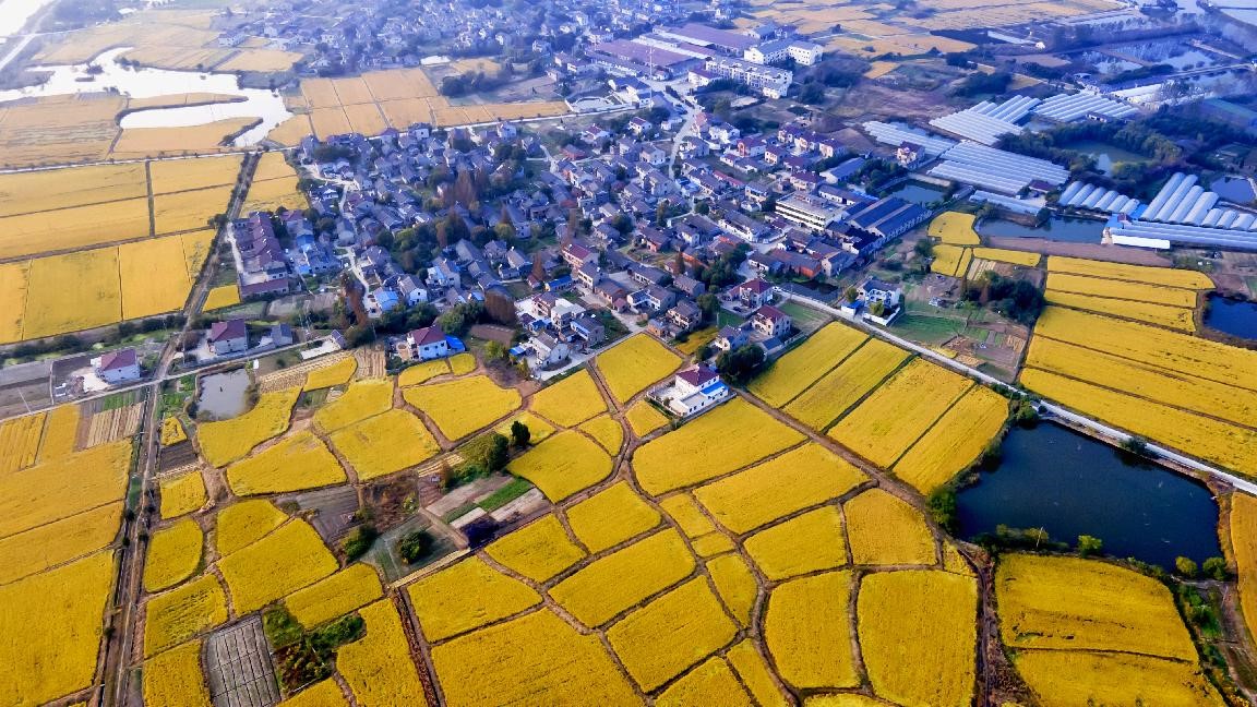 Rice are ripe in Hubin village, Guyang township, Dantu district, Zhenjiang, east China's Jiangsu province, Oct. 30, 2021. (People's Daily Online/Wei Xueliang)