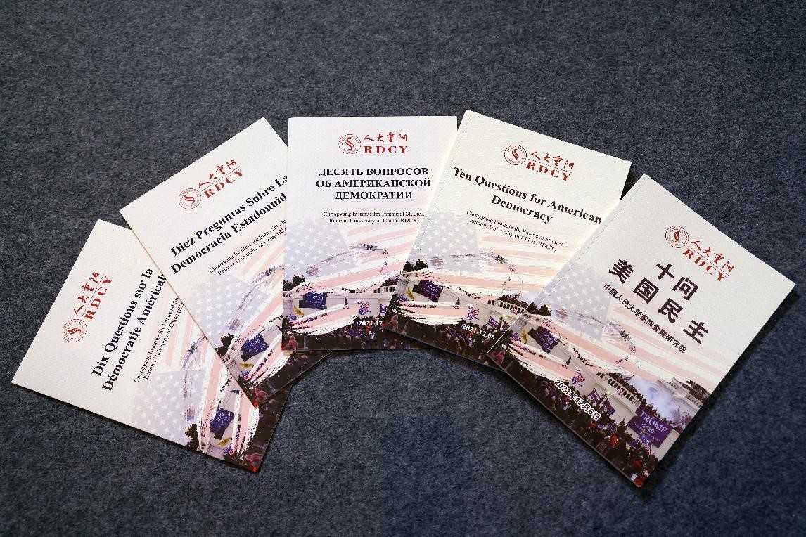 Photo shows the Chinese, English, French, Russian and Spanish editions of the research report titled “Ten Questions for American Democracy” released by Chongyang Institute for Financial Studies, Renmin University of China. (Photo/Chongyang Institute for Financial Studies, Renmin University of China)