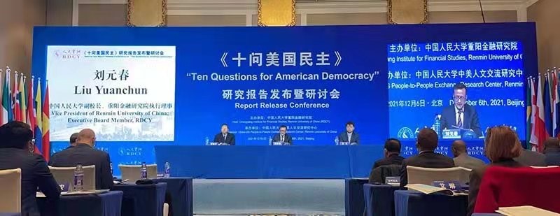 The Chongyang Institute for Financial Studies, Renmin University of China, issued a research report during a press conference on Monday, raising ten questions on American democracy from ten angles, including the American system in practice, national governance, social circumstances, human rights, and freedom situation, and international influence, while telling the truths about American democracy by citing vast amounts of facts, data, and opinions of various institutions, personages, and experts in the world.