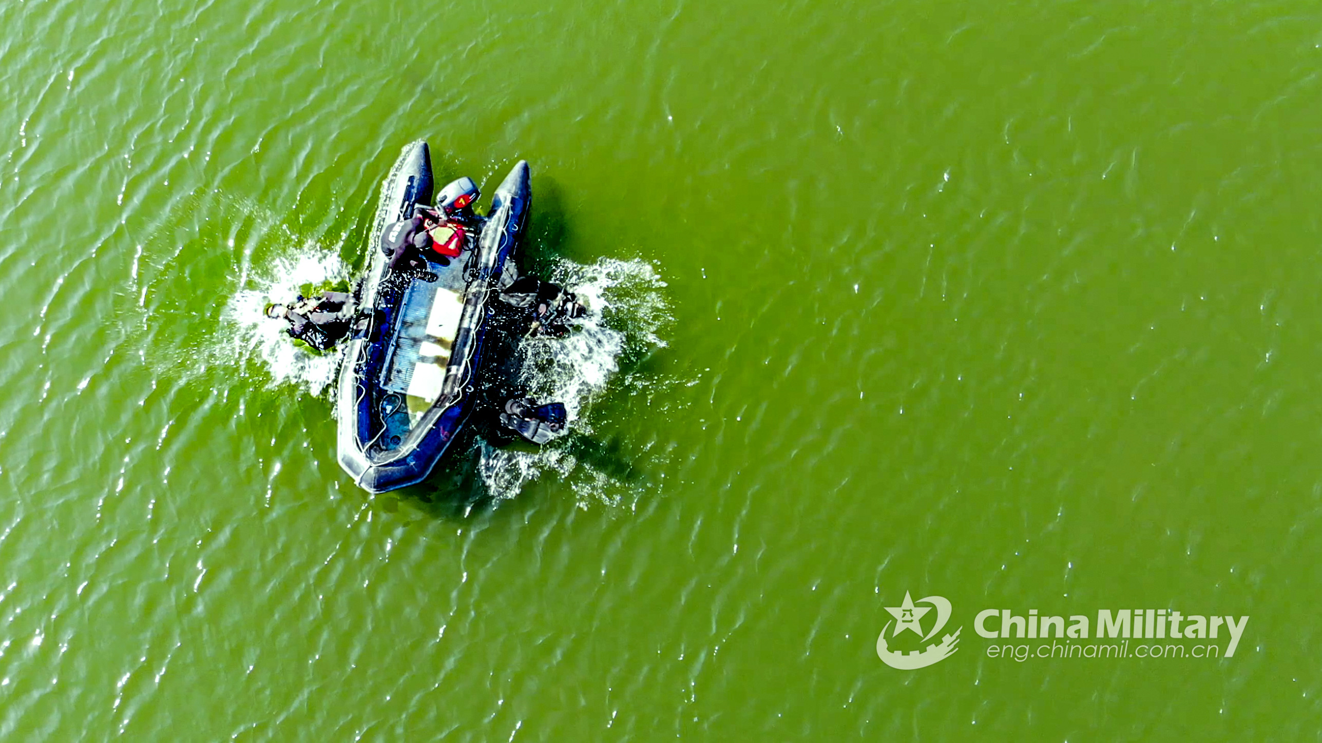 Frogmen assigned to a special operations group under the PLA Navy's Marine Corps dive into the water from the combat rubber raiding craft (CRRC) during an amphibious assault training exercise on November 18, 2021. (eng.chinamil.com.cn/Photo by Sun Hongtao)