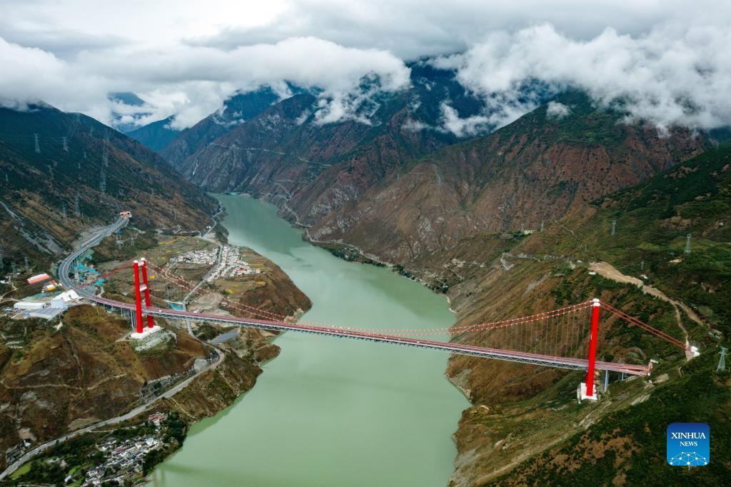 Aerial photo taken on Oct. 21, 2021 shows the Luding grand bridge across Daduhe River of Ya'an-Kangding expressway in southwest China's Sichuan Province. A series of "Super Projects" in Sichuan have been built to promote the development of western China, making contributions to local economic and social development. (Xinhua/Shen Bohan)