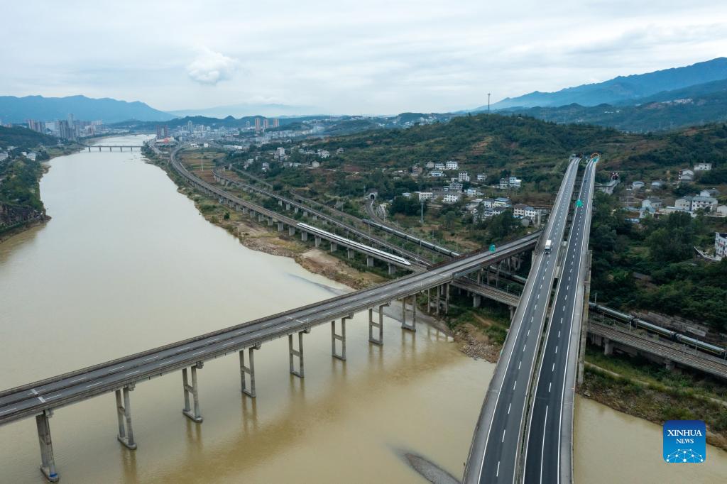Aerial photo taken on Oct. 19, 2021 shows a meeting point of the sections of Sichuan-Shaanxi highway, Beijing-Kunming expressway, Baoji-Chengdu railway, Xi'an-Chengdu high-speed railway and Jialing River shipping lane in southwest China's Sichuan Province. A series of "Super Projects" in Sichuan have been built to promote the development of western China, making contributions to local economic and social development. (Xinhua/Shen Bohan)