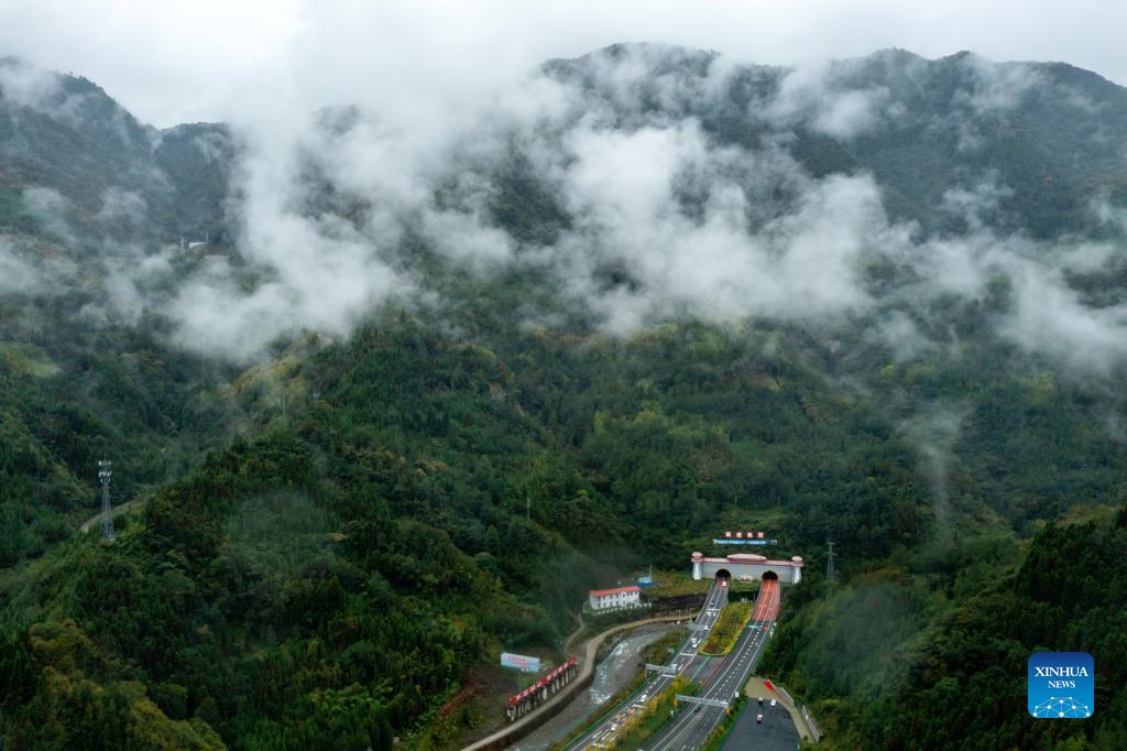 Aerial photo taken on Oct. 21, 2021 shows an entrance of a tunnel on Ya'an-Kangding expressway in southwest China's Sichuan Province. A series of "Super Projects" in Sichuan have been built to promote the development of western China, making contributions to local economic and social development. (Xinhua/Shen Bohan)