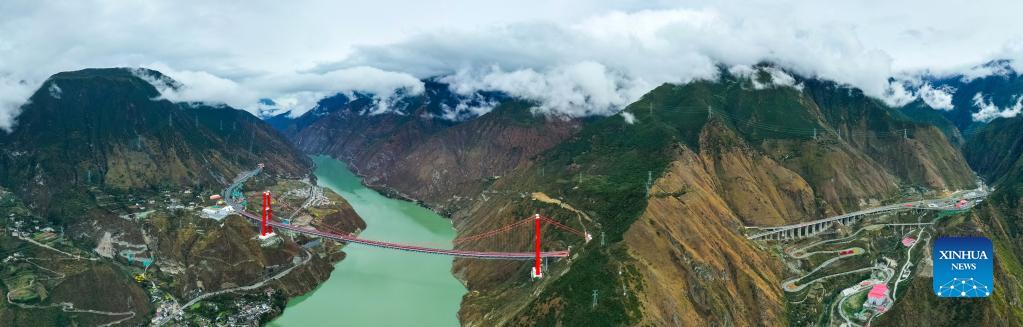 Aerial panoramic photo taken on Oct. 21, 2021 shows the Luding grand bridge across Daduhe River on Ya'an-Kangding expressway (L) and a section of Ya'an-Kangding expressway in southwest China's Sichuan Province. A series of "Super Projects" in Sichuan have been built to promote the development of western China, making contributions to local economic and social development. (Xinhua/Shen Bohan)
