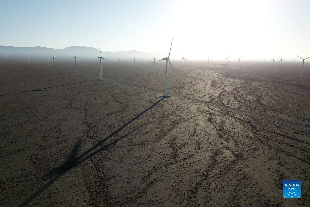 Aerial photo taken on Dec. 8, 2021 shows wind turbines at Changma wind farm in Yumen City, northwest China's Gansu Province. As of October 2021, the total installed new energy power generating capacity in Gansu Province has reached 25.2 million kilowatts. (Xinhua/Fan Peishen)