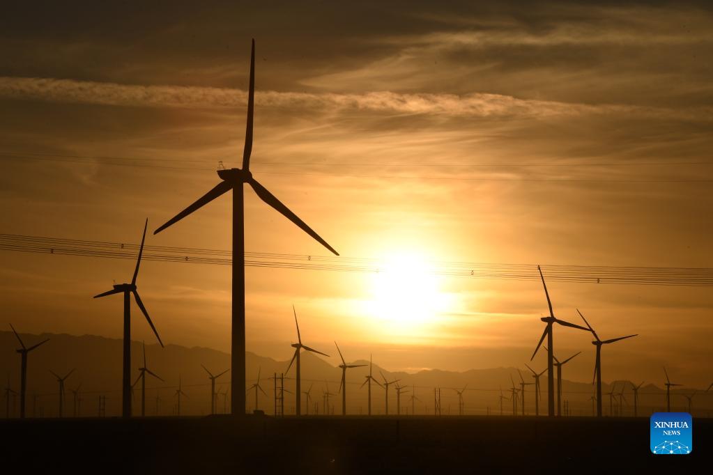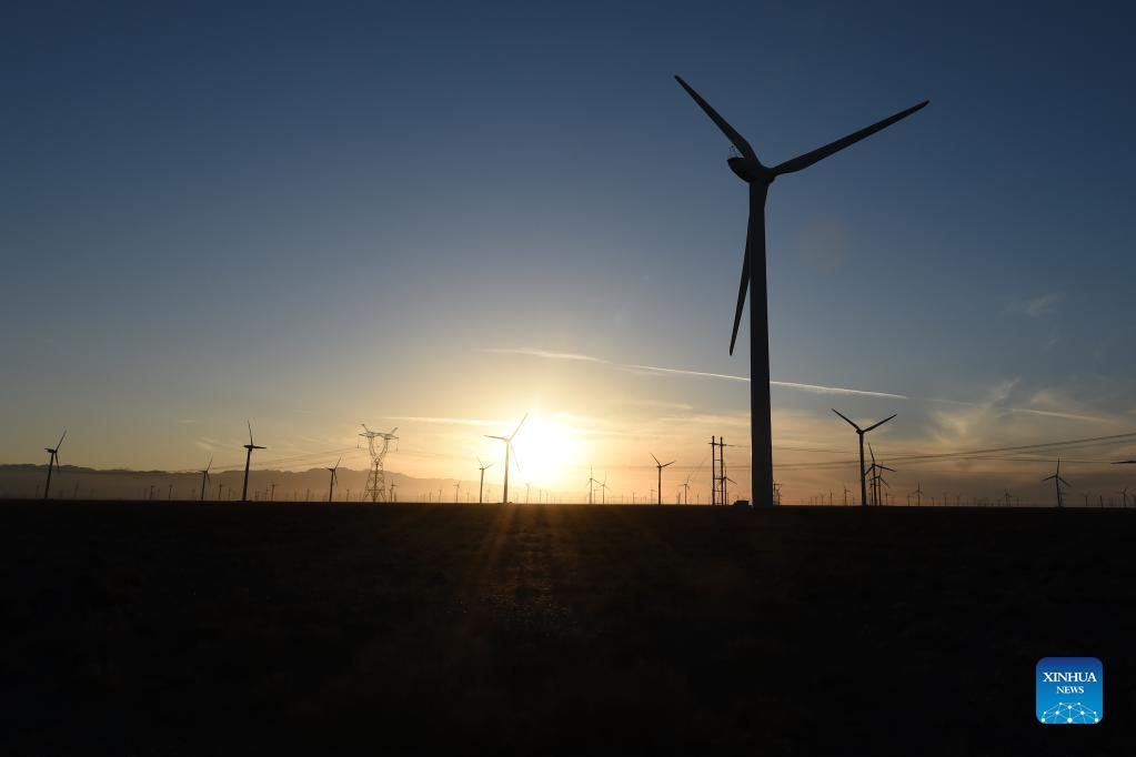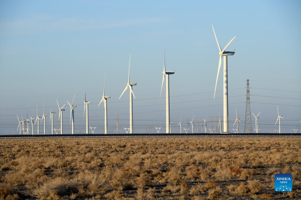 Photo taken on Dec. 8, 2021 shows wind turbines at Changma wind farm in Yumen City, northwest China's Gansu Province. As of October 2021, the total installed new energy power generating capacity in Gansu Province has reached 25.2 million kilowatts. (Xinhua/Fan Peishen)