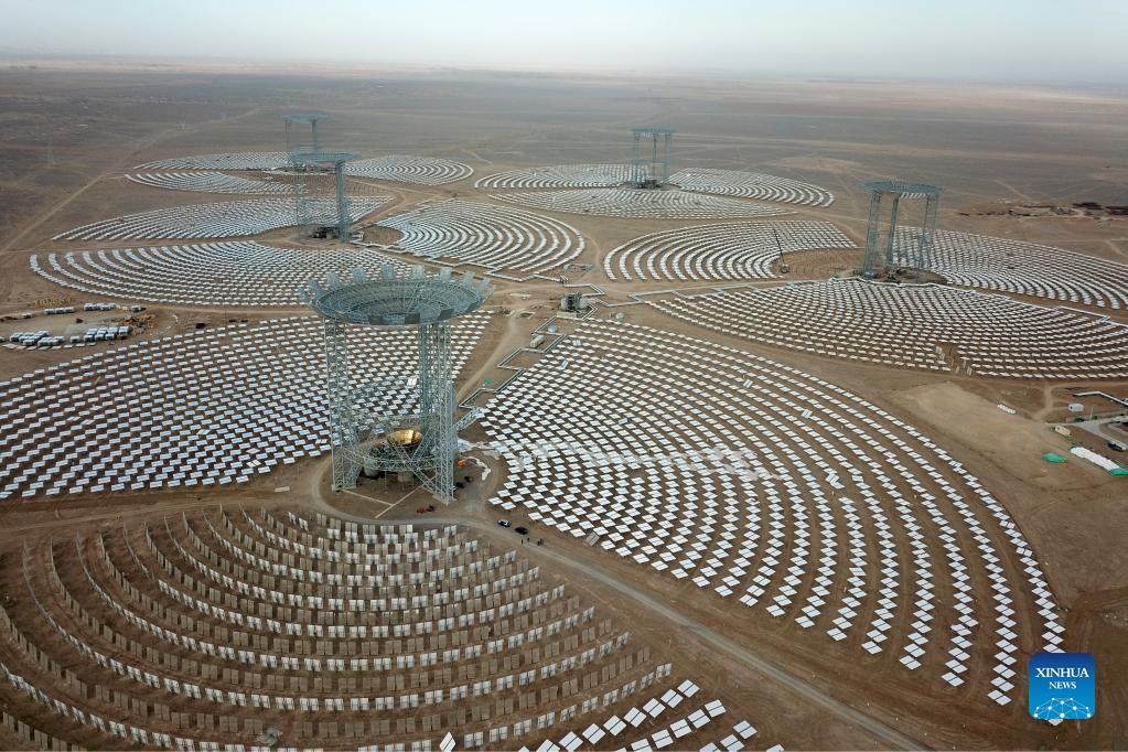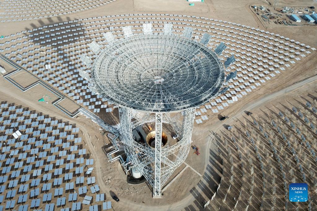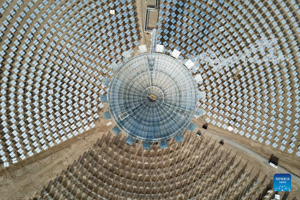Aerial photo taken on Dec. 8, 2021 shows a molten-salt solar thermal power plant in Yumen City, northwest China's Gansu Province. As of October 2021, the total installed new energy power generating capacity in Gansu Province has reached 25.2 million kilowatts. (Xinhua/Fan Peishen)