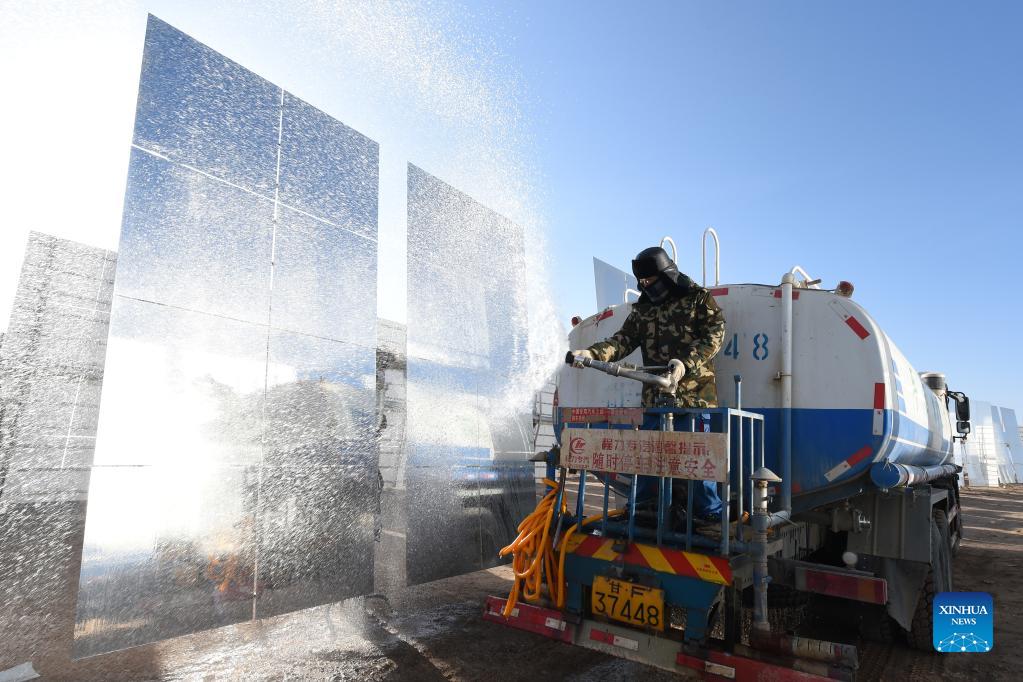 A worker rinses heliostats at a molten-salt solar thermal power plant in Yumen City, northwest China's Gansu Province, Dec. 8, 2021. As of October 2021, the total installed new energy power generating capacity in Gansu Province has reached 25.2 million kilowatts. (Xinhua/Fan Peishen)