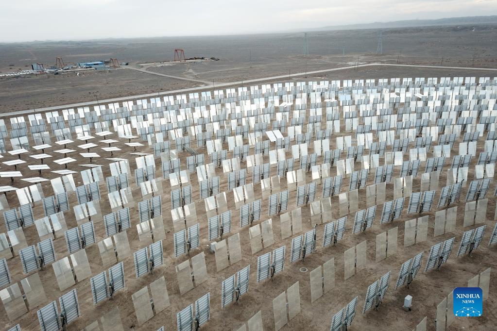 Aerial photo taken on Dec. 8, 2021 shows heliostats at a molten-salt solar thermal power plant in Yumen City, northwest China's Gansu Province. As of October 2021, the total installed new energy power generating capacity in Gansu Province has reached 25.2 million kilowatts. (Xinhua/Fan Peishen)
