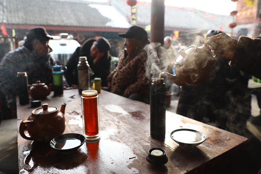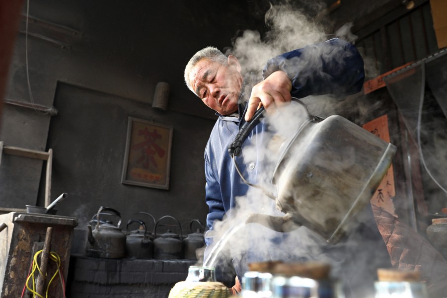 Photo taken on Jan. 3, 2021 shows a waiter fills a teapot with water at a teahouse in Linhuan Township, Suixi County, east China's Anhui Province. (Xinhua/Wan Shanchao)