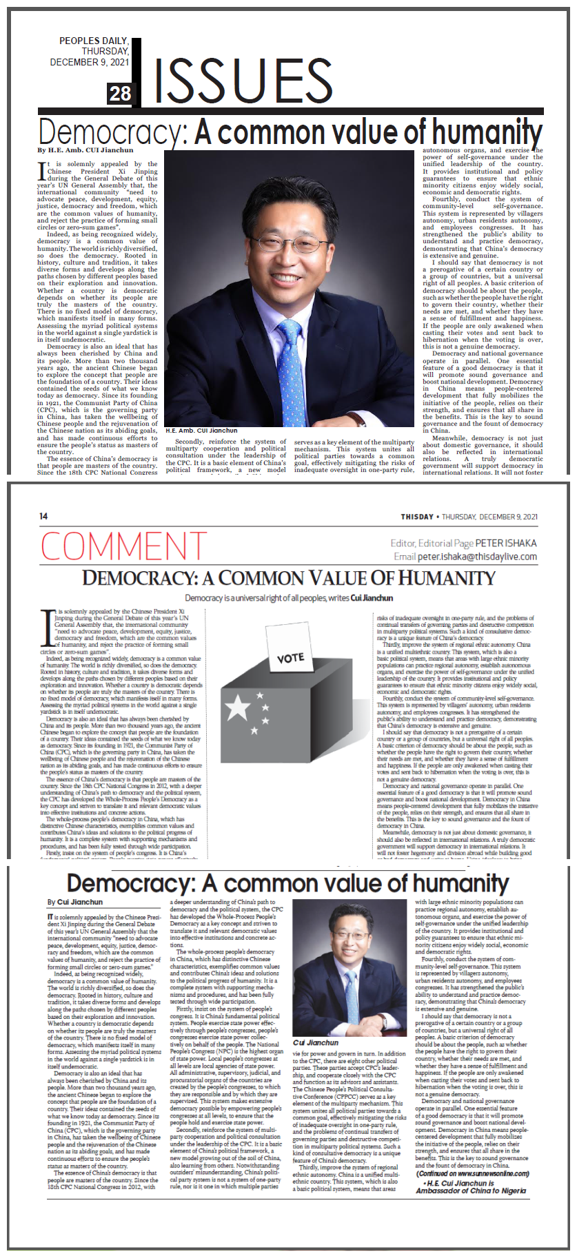 On December 9th, 2021, Nigerian newspapers Peoples Daily, This Day, Daily Sun published an article written by Ambassador of China to Nigeria H.E. CUI Jianchun, with the theme of Democracy:A Common Value of Humanity. The full text goes as follows: