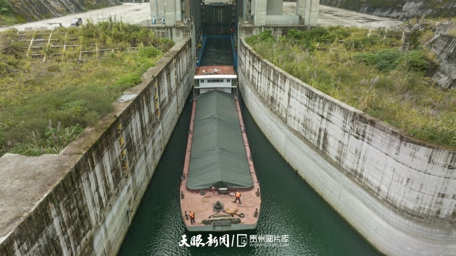 Photo shows a ship sailing toward the second ship lifts through a water channel along the Goupitan hydropower station navigation project. (Photo/gzspic.com)