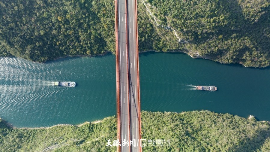 Photo shows ships moving underneath the Heshandu Wujiang River Grand Bridge located in southwest China's Guizhou Province. (Photo/gzspic.com)