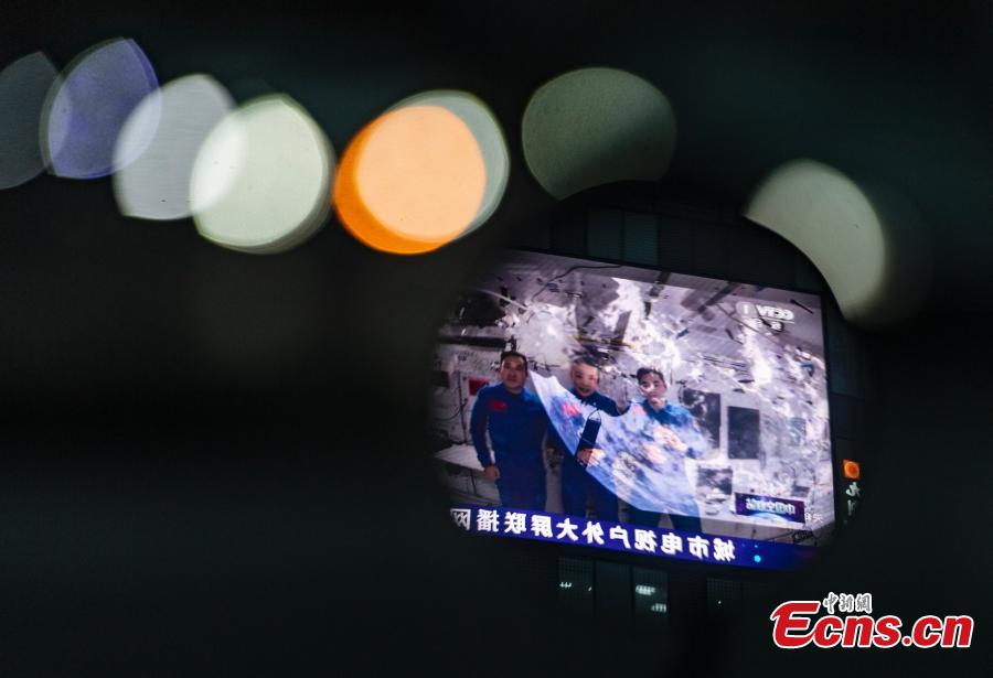 The Shenzhou-13 crew members Zhai Zhigang, Wang Yaping and Ye Guangfu give the first space lecture from China's space station Tiangong, Dec. 9, 2021. (Photo: China News Service/Hou Yu)