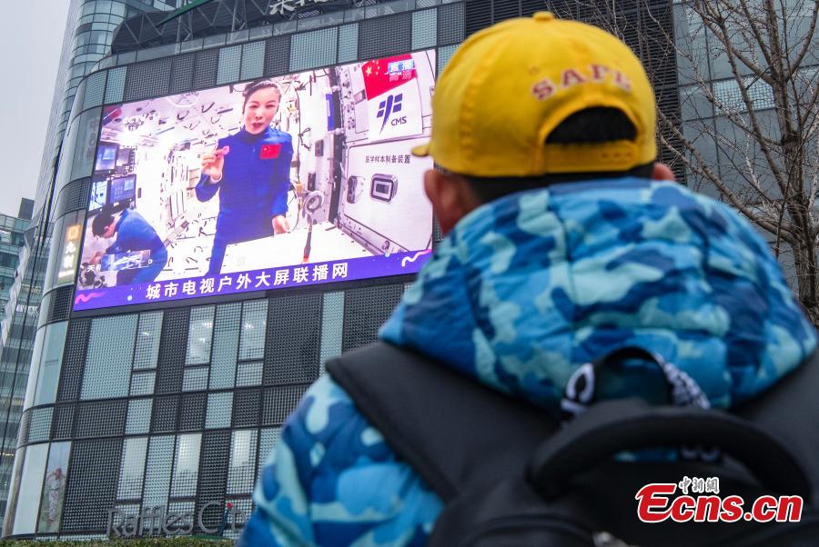 A child watches a live class delivered by the Shenzhou-13 crew, in front of an outdoor screen in Dongcheng District, Beijing, Dec. 9, 2021. China's first space class from its space station Tiangong was held on Thursday afternoon, given by Shenzhou-13 crew members Zhai Zhigang, Wang Yaping and Ye Guangfu. (Photo: China News Service/Hou Yu)