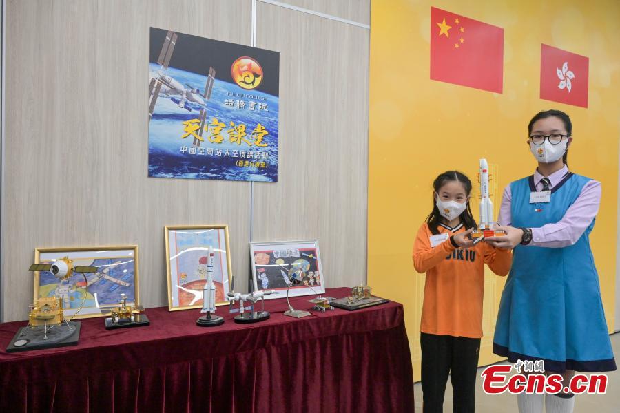 Hong Kong students present a model of a carrier rocket at Pui Kiu College in Sha Tin, Hong Kong Special Administrative Region, Dec. 9, 2021. (Photo: China News Service/Chen Yongnuo)