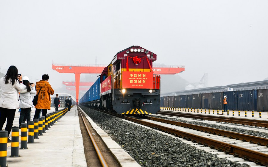 The first direct China-Europe freight train linking Guizhou Province and Russia's Moscow sets out from Guiyang, southwest China's Guizhou Province, Nov. 18, 2021. (Xinhua/Yang Wenbin)